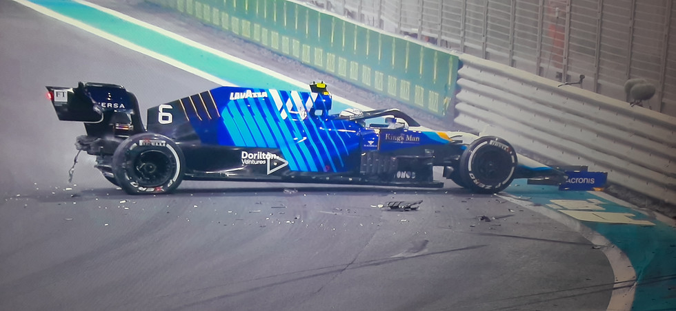 Vuelta 53 de 58. ¡Latifi se impacta contra el muro! Pedazos de auto ocupan la pista. Se anuncia el ingreso del auto de seguridad, los autos disminuyen su paso, Verstappen entra por recambio de gomas, tendrá llantas suaves, rojas, de gran adherencia, una esperanza para lograr adelantar a Hamilton. Checo entra también por gomas rojas.
